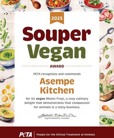On December 3, a popular menu item from Asempe Kitchen was named as one of the Top 10 Vegan Soups and Stews in the United States by PETA. The winning dish, called Nkatsi Froyi, is described by PETA as a “velvety, West African-inspired stew that blends peanuts and a savory tomato base, seasoned with curry and other toasty spices.”