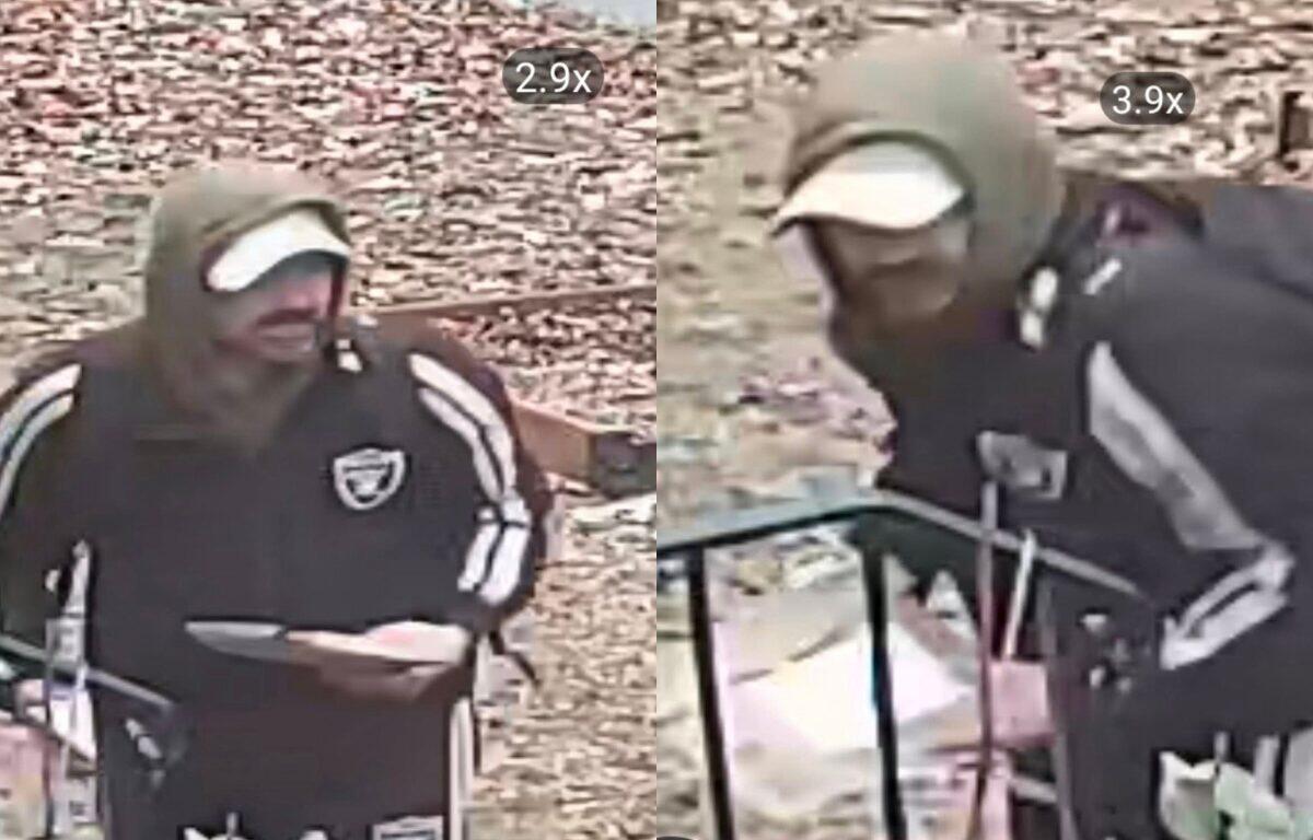 A bearded man wearing a dark jacket was caught on camera stealing packages from a porch in the 800 block of Grove Street. Police say cameras also showed the suspect with several other packages, indicating other thefts.