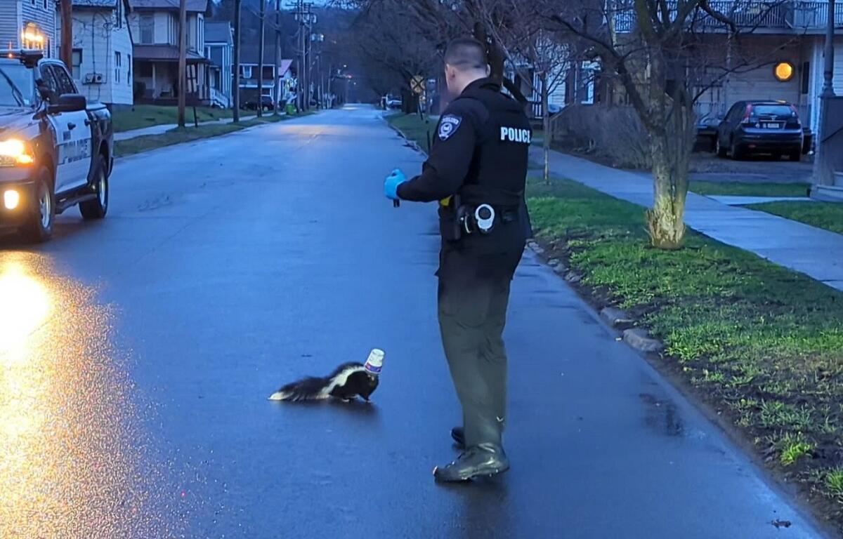 Officer Jordan Cowen carefully approached the animal and was able to remove the cup without being sprayed. The skunk shared a look with Cowen for a moment before scurrying away.