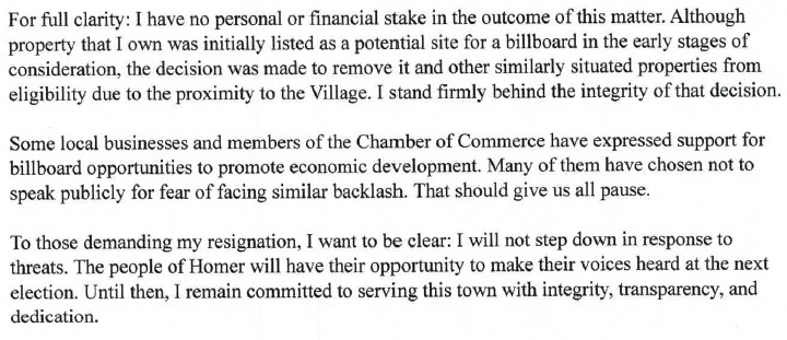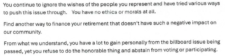 Michael Park says he received an anonymous letter on Wednesday requesting his resignation by last Friday or take the risk of “unpleasant things” happening to him, his family, and business. The letter accuses Park of profiting from a proposed billboard resolution and ignoring “wishes of the people.”