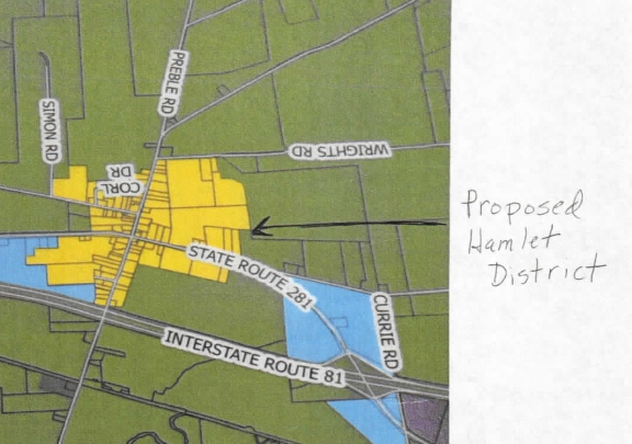 The group will continue talking about a draft zoning law. The draft includes a new hamlet district that includes parts of Preble Road and Corl Drive.