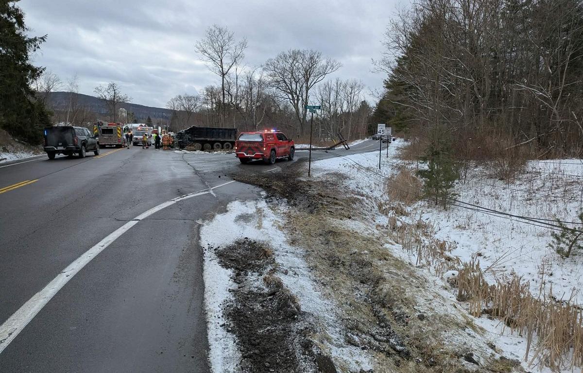 A large dump truck rolled over and snapped a utility pole, resulting in broken wires in the roadway. Multiple agencies were called to secure the scene, and the area was shut down for several hours while NYSEG secured the wires and reconnected power.