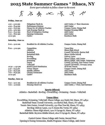 The games are scheduled for the third weekend in June, with opening ceremonies set for Friday, June 21 at Ithaca College.